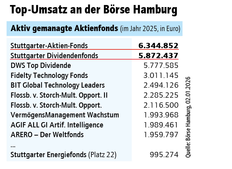 Der Stuttgarter-Aktien-Fonds belegte 2025 unter rund 1.500 aktiv gemanagten Aktienfonds an der Börse Hamburg den Platz 1 der umsatzstärksten, dicht gefolgt vom Stuttgarter Dividendenfonds auf Platz 2.