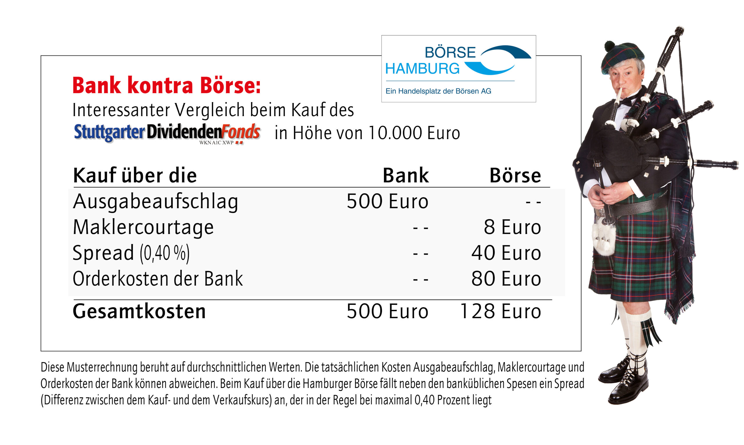 Im Kasten oben sehen Sie den Sparvorteil anhand einer Beispielrechnung am Stuttgarter Dividendenfonds. Hier spart der Anleger beim Kauf über die Börse bei einer Anlagesumme von 10.000 Euro nahezu 400 Euro gegenüber dem klassischen Kauf über die Fondsgesellschaft.