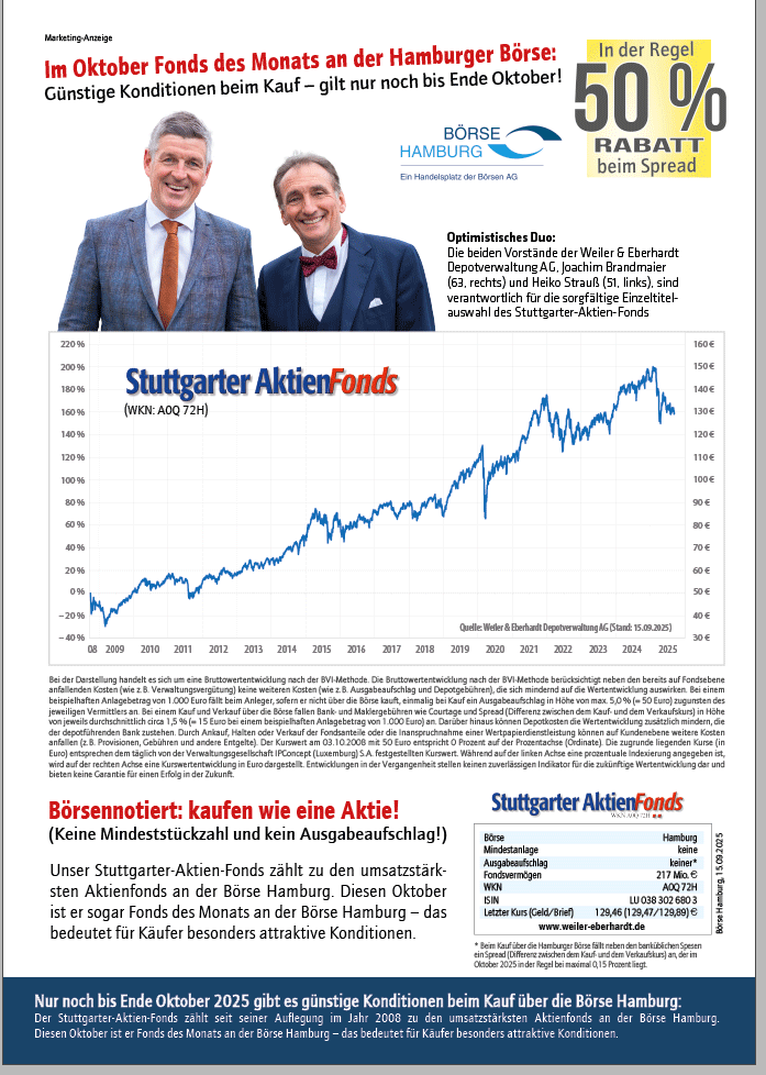 Der Stuttgarter-Aktien-Fonds ist Fonds des Monats an der Börse Hamburg – das bedeutet für Käufer den ganzen Monat Oktober besonders attraktive Konditionen: