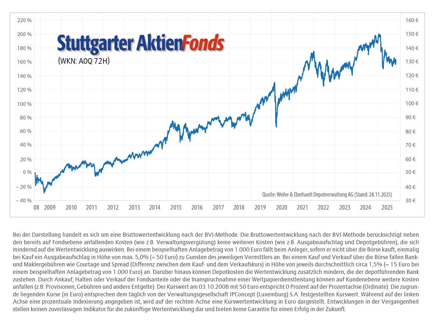Natürlich gibt es keine Garantie für steigende Kurse, und Aktien sowie der ganze Fonds können auch mal fallen. Die breite Mischung sowie der langfristige Anlagehorizont sind aber zwei wichtige Faktoren, die den Stuttgarter-Aktien-Fonds auszeichnen. Außerdem werden erhaltene Dividenden reinvestiert, sodass die Cashquote immer gering ist. Durch die Wiederanlage der Ausschüttungen kann außerdem das Gleichgewicht innerhalb der Zusammenstellung gewährleistet werden. Mit dem Stuttgarter-Aktien-Fonds legen Sie Ihr Geld in einem breit gestreuten und auf die Zukunft ausgerichteten Fonds gemäß unserer Expertenanalyse an. Kurzfristig kann es aber auch hier zu volatileren Kursbewegungen kommen, wie die Vergangenheit gezeigt hat. Auf lange Sicht zeigt die bisherige Performance jedoch – wie im Chart zu sehen – klar nach oben.
