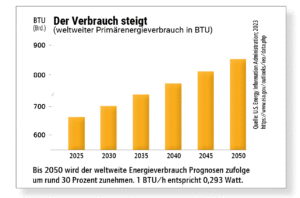 Seit Jahrzehnten nimmt die globale Energienachfrage kontinuierlich zu. Zu den Haupttreibern gehören neben dem Wachstum der Weltbevölkerung auch der technische Fortschritt und der in weiten Teilen der Erde steigende Lebensstandard. Laut den Vereinten Nationen sollen in den nächsten 30 Jahren fast zwei Milliarden Menschen zusätzlich den Erdball bevölkern. Und mehr Menschen bedeuten im Umkehrschluss in der Regel auch mehr Energienachfrage. Große Teile des Wachstums kommen dabei aus den Mittelschichten: Laut der OECD gehören dazu heute etwa zwei Milliarden Menschen. Das sind jene, die zwischen zehn und einhundert Dollar am Tag ausgeben können. Bis 2030 soll die Zahl auf fast vier Milliarden Menschen anwachsen – sich also verdoppeln. Während sich das Wachstum der Mittelschichten vor allem in den Schwellenländern abspielt, gibt es auch in den entwickelten Ländern, allen voran in den USA, gute Gründe für steigende Energienachfrage; insbesondere bei Strom. Treiber ist hier vor allem der Technologiesektor. Aufgrund der Fortschritte bei Themen wie künstlicher Intelligenz und der entsprechend hohen Nachfrage nach Cloud-Diensten und Rechenleistung bauen die großen Branchenvertreter aus dem Technologiebereich reihenweise neue Datenzentren und Serverfarmen. Und die brauchen Strom – viel Strom. Zudem muss jede Menge Geld in die Hand genommen werden, um die mitunter in die Jahre gekommene Strom-Infrastruktur den wachsenden Herausforderungen anzupassen; auch im Zuge der Einbindung der erneuerbaren Energien. Alles in allem geht die Energiebehörde U.S. Energy Information Administration davon aus, dass der Weltenergieverbrauch bis 2050 um rund 30 Prozent steigen wird.