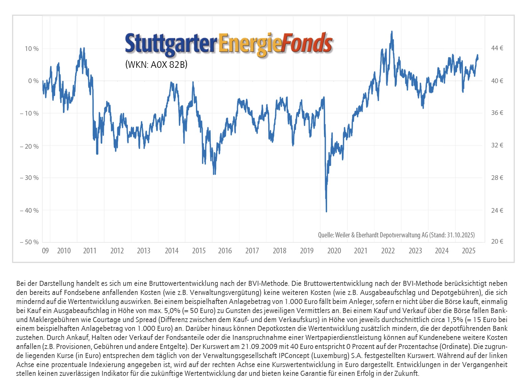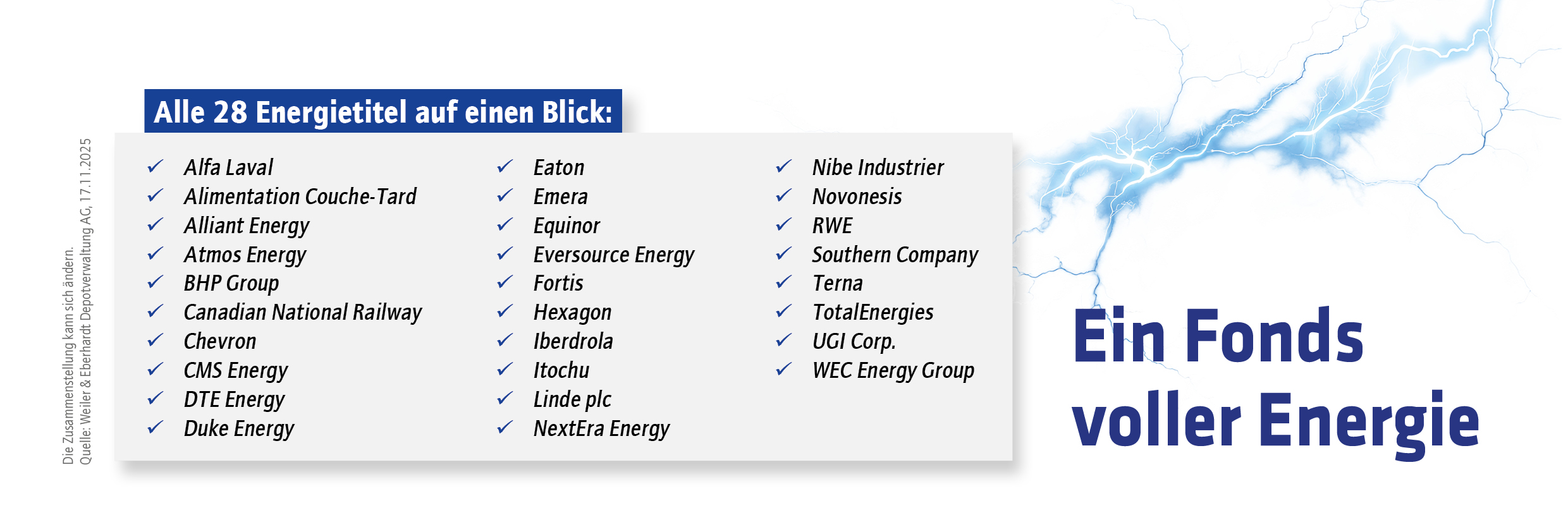 Anlegern, die in die Energiebranche investieren möchten, hier aber nicht auf Einzeltitel setzen wollen, bietet sich ein diversifizierter Fonds wie der Stuttgarter Energiefonds an. Das Team der Weiler & Eberhardt Depotverwaltung AG um die Vorstandsmitglieder Joachim Brandmaier und Heiko Strauß managt den Fonds nicht auf Grundlage eines Index, sondern richtet den Fokus bei seinen Analysen und Entscheidungen in erster Linie auf die einzelnen Unternehmen. Auch der Branchenbegriff wird weit gefasst. Unternehmen mit einem energiebezogenen Umsatzanteil ab zehn Prozent können in den aktiv verwalteten Stuttgarter Energiefonds aufgenommen werden. Das Anlageuniversum ist entsprechend breit und enthält alle denkbaren Unternehmen der Wertschöpfungskette: von Zulieferern und Dienstleistern über Transport bis hin zum Vertrieb und zu der Weiterverarbeitung zu Endprodukten. Zu den Vorteilen gehört neben der Streuung über derzeit 28 Titel auch seine hohe Transparenz. Durch regelmäßiges Rebalancing achten wir zudem darauf, dass die Mischung weitgehend ausgewogen bleibt und keine zu großen Abhängigkeiten von Einzeltiteln entstehen.